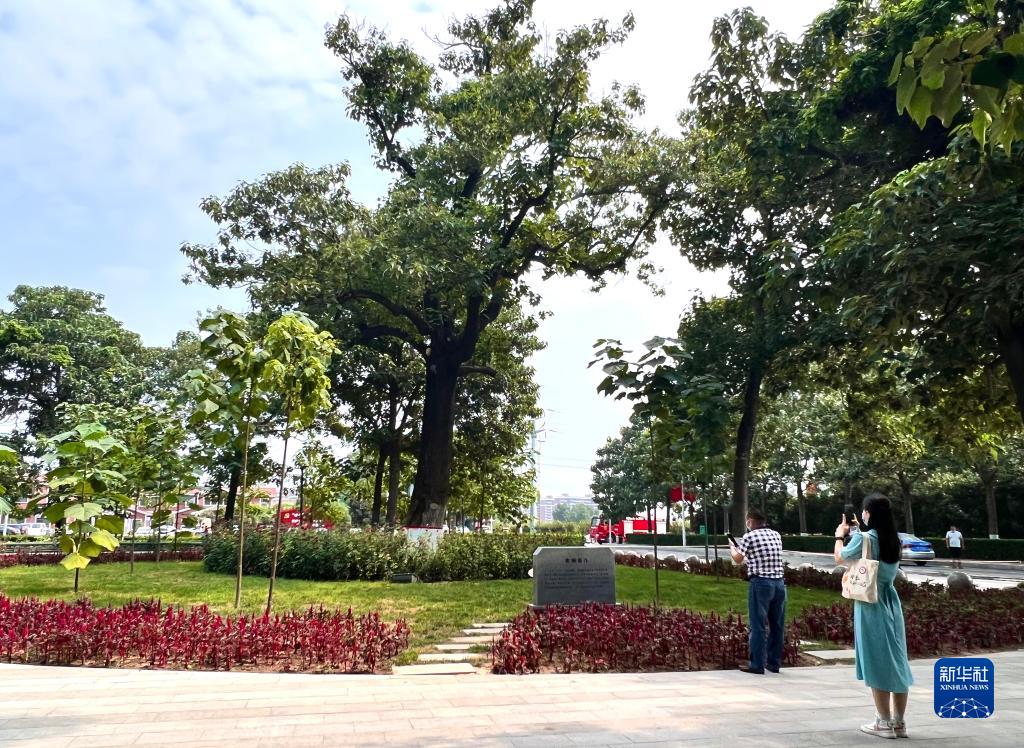 在河南省蘭考縣焦裕祿干部學(xué)院門(mén)口,人們在“焦桐”下參觀(guān)(2022年8月15日攝)。新華社記者 郝源 攝