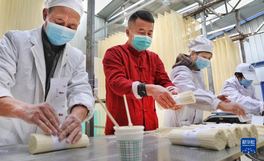 李長(cháng)滿(mǎn)(左一)在包裝成品空心掛面(3月18日攝)。