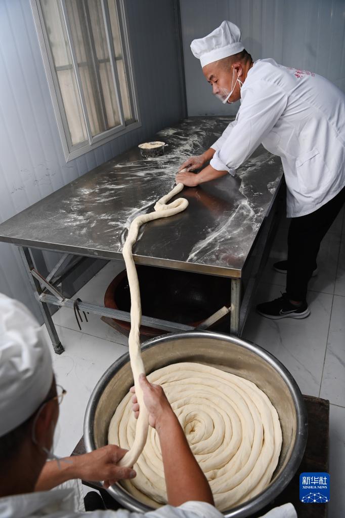 8月16日,兒子李念平(右)配合父親在進(jìn)行空心掛面的“搓條盤(pán)面”工序。
