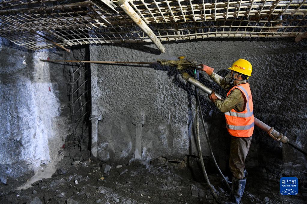 8月16日,在位于廣西環(huán)江毛南族自治縣的貴南高鐵九萬(wàn)大山四號隧道內,工作人員用風(fēng)槍打爆破眼。