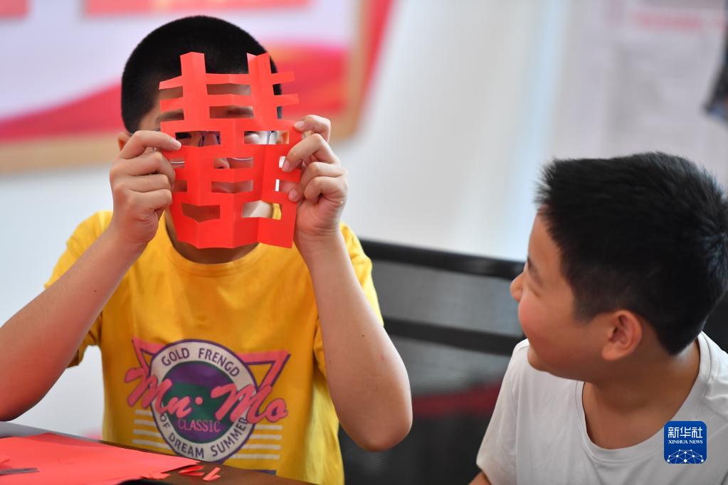 8月17日,在湘潭市雨湖區窯灣街道唐興寺社區,小朋友在展示自己的剪紙作品。