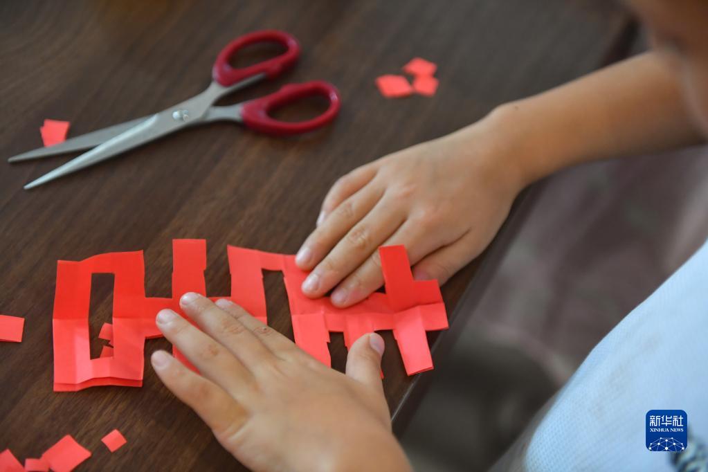 8月17日,在湘潭市雨湖區窯灣街道唐興寺社區,小朋友在體驗剪紙。