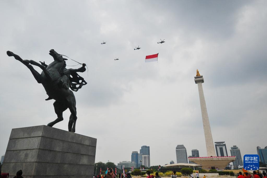8月17日,懸掛印度尼西亞國旗的飛機編隊飛過(guò)首都雅加達的民族獨立紀念碑上空。