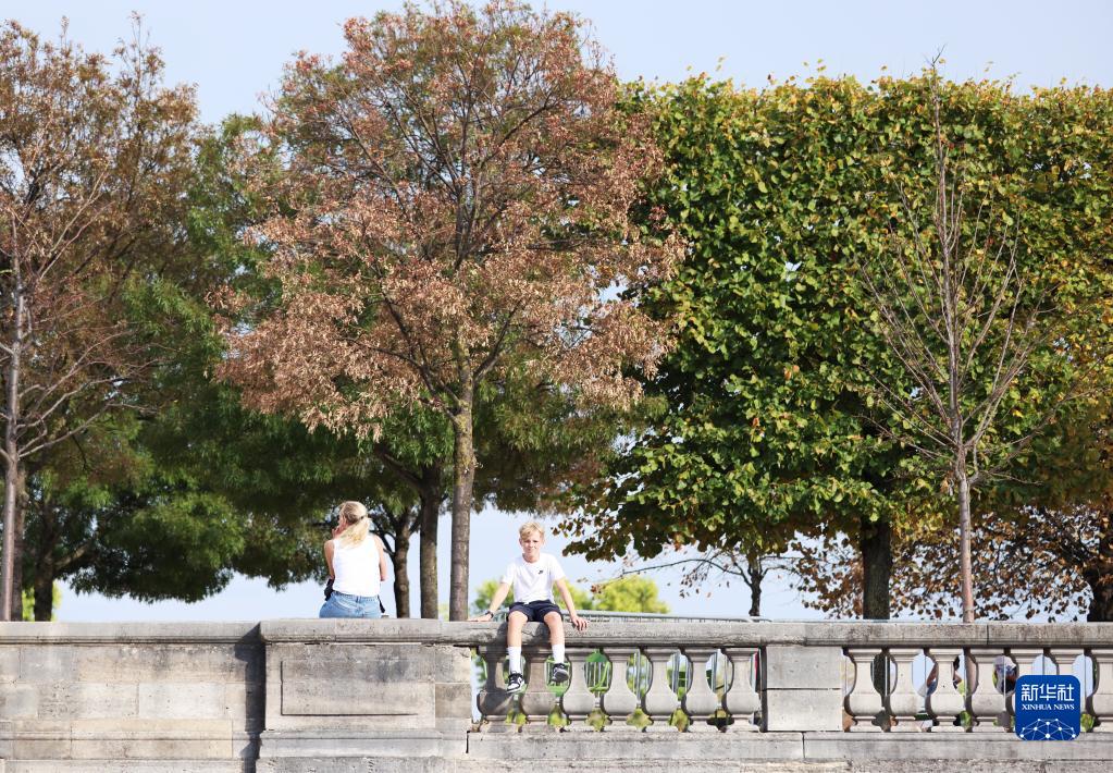 8月17日,一對母子在法國巴黎杜勒里花園小憩,部分樹(shù)葉泛黃干枯并脫落。