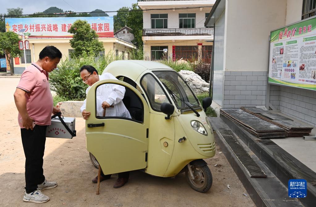 8月17日,村醫牛薛武(右)帶著(zhù)醫療器具,駕駛殘疾人專(zhuān)用電動(dòng)車(chē)趕往患者住處。