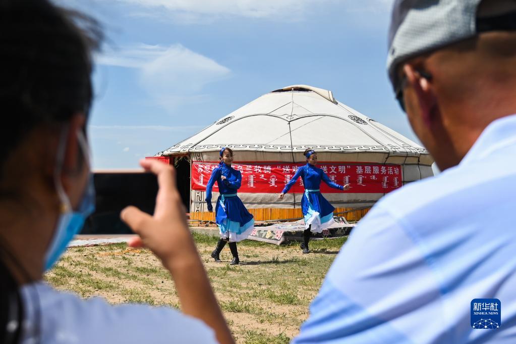 8月17日,在敦達烏蘇嘎查演出點(diǎn),烏蘭牧騎隊員在表演節目。