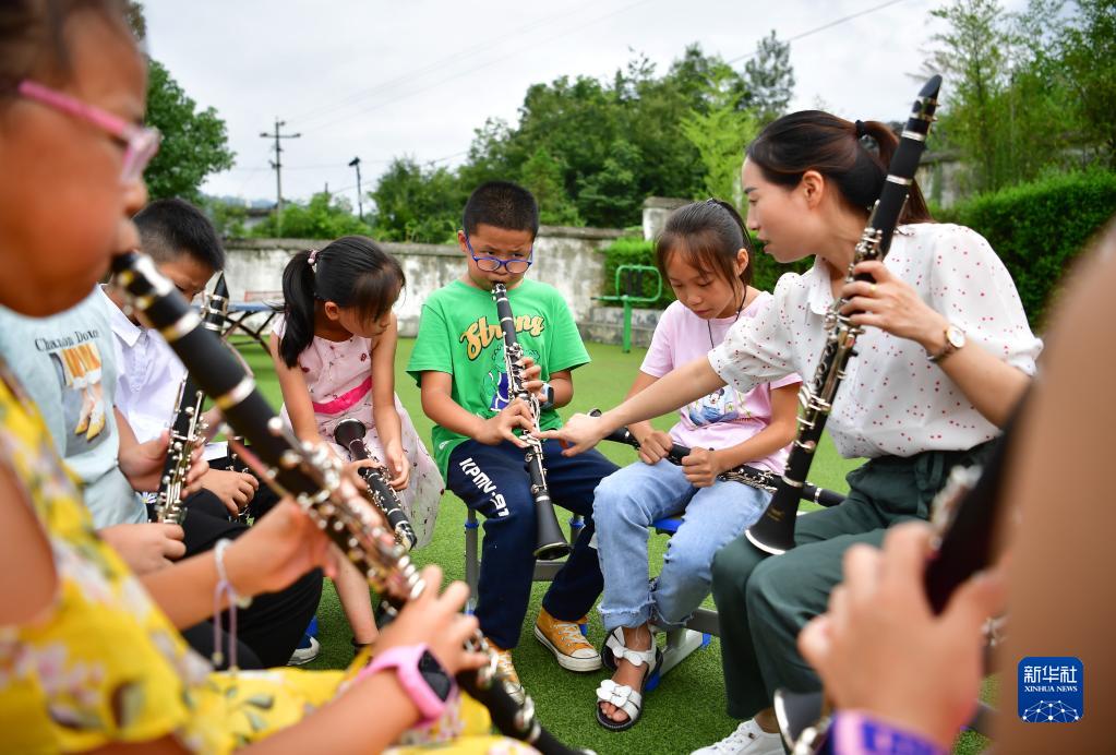 老縣鎮中心小學(xué)暑期興趣小組的學(xué)生在老師的指導下練習單簧管(2020年7月24日攝)。