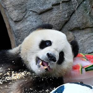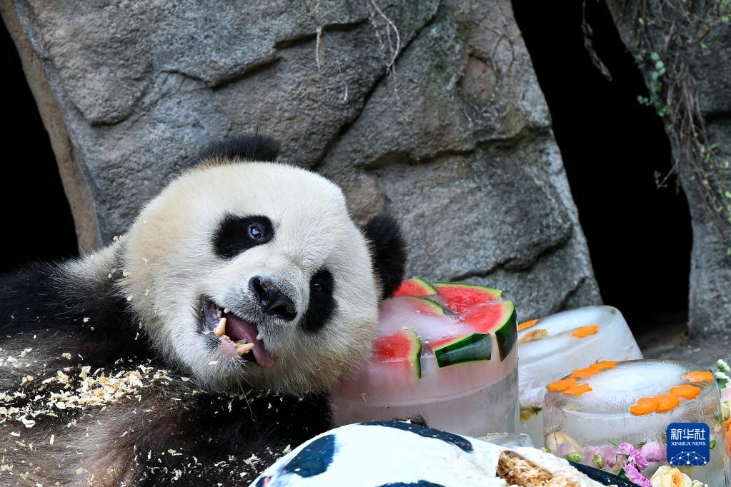 8月18日,中國大熊貓保護研究中心都江堰基地7歲的雄性大熊貓“青青”享受清涼生日美食。