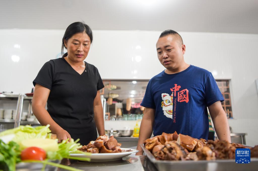 8月17日,在扎賚特旗好力保農業(yè)專(zhuān)業(yè)合作社內的農家樂(lè ),宋春平(左)查看菜品。