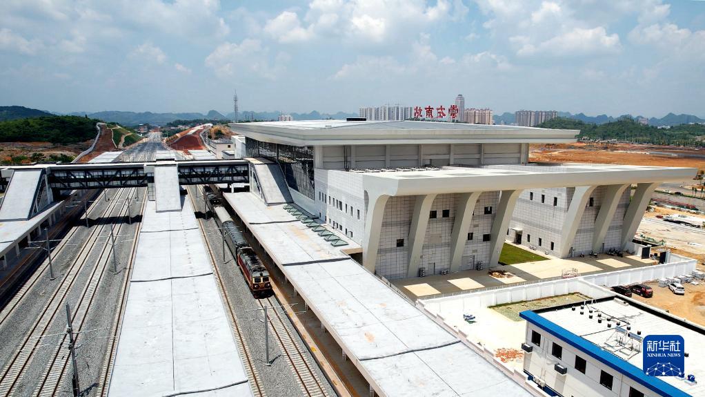 8月18日,南崇鐵路聯(lián)調聯(lián)試檢測車(chē)駛達崇左南站(無(wú)人機照片)。