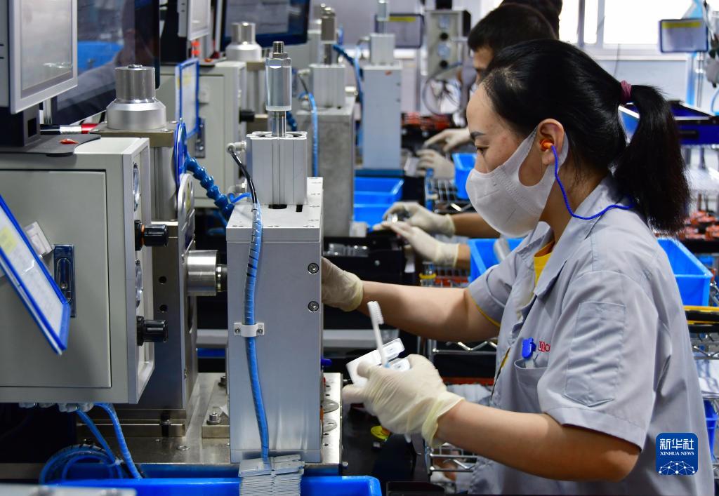 工人在寧德壹連電子有限公司新能源電池配件生產(chǎn)線(xiàn)上作業(yè)(8月17日攝)。