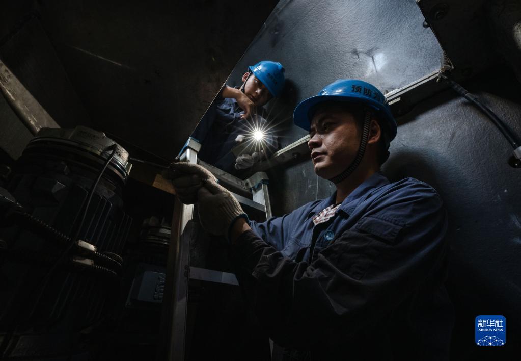 8月18日,三峽姚安發(fā)電場(chǎng)工程人員在風(fēng)力發(fā)電機內進(jìn)行檢修。