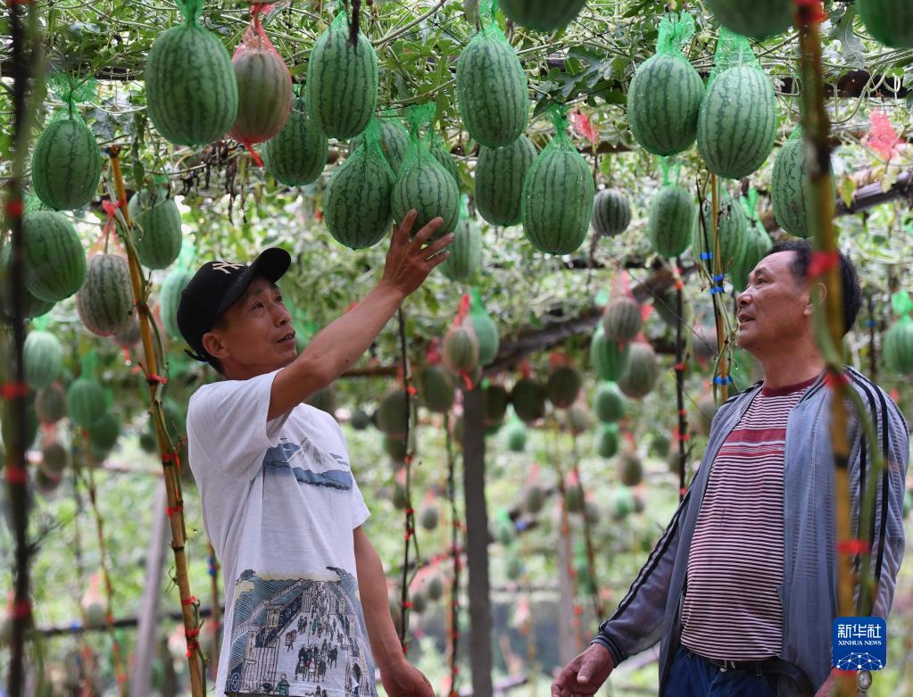 在福建省福州市閩侯縣大湖鄉東姚村的“湖東果蔬農民專(zhuān)業(yè)合作社”種植基地,村民在查看西瓜長(cháng)勢(8月17日攝)。