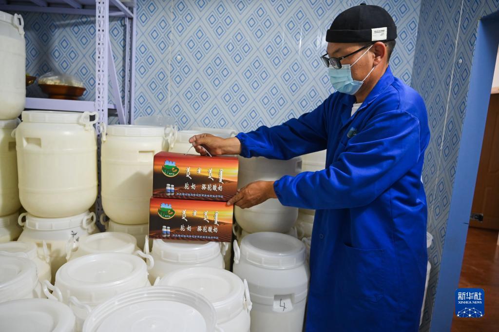 8月18日,蘇尼特右旗雙峰駝繁育養殖基地職工馬拉慶夫在冷庫里查看駝奶制品。