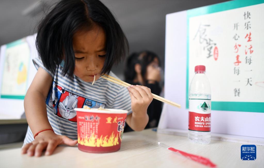 8月19日,小朋友在大通一中臨時(shí)安置點(diǎn)餐廳內吃午餐。