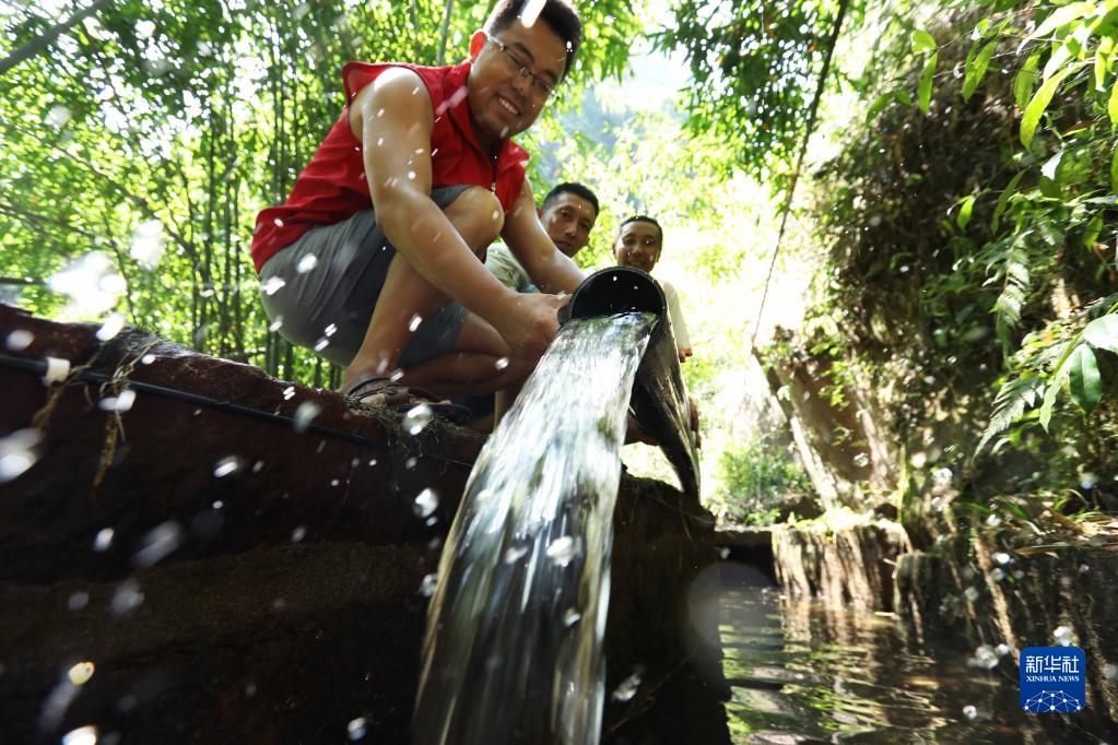 8月18日,在貴州省赤水市寶源鄉聯(lián)華村,黨員干部將新辟的清泉接進(jìn)飲用水渠。
