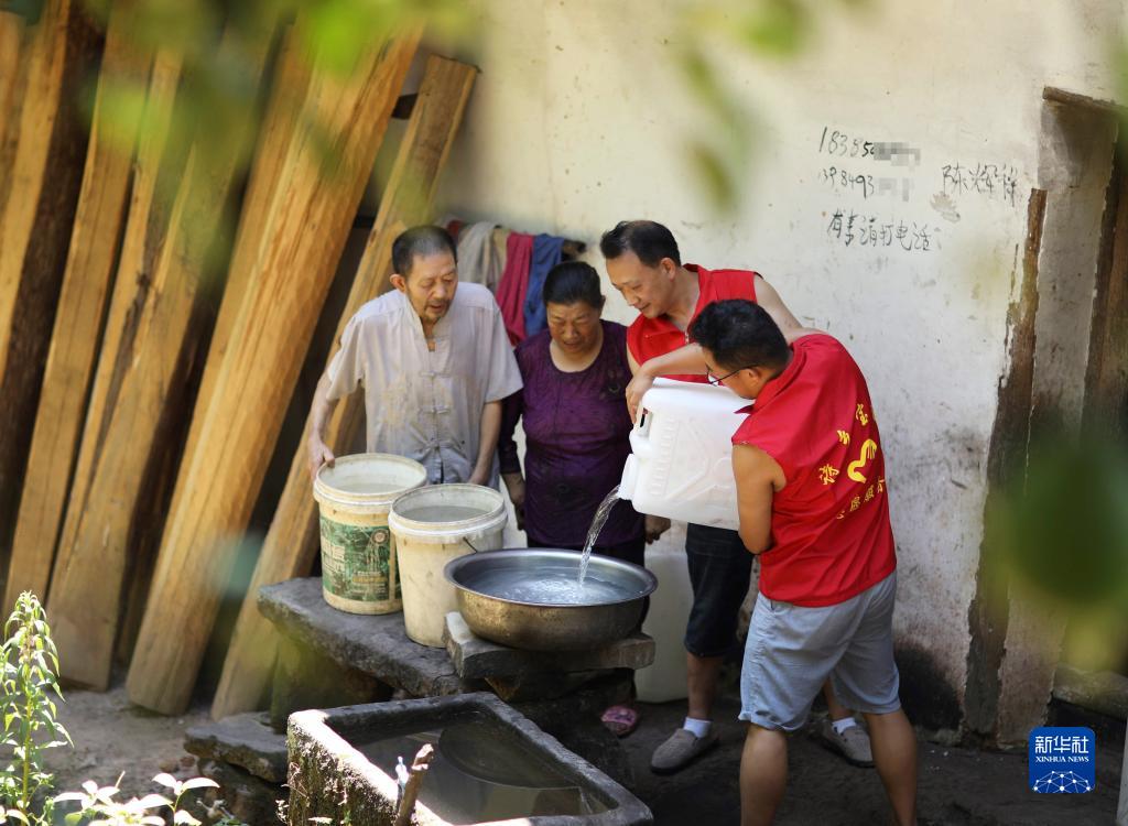 8月18日,在貴州省赤水市寶源鄉玉豐村,黨員干部為村民送水。