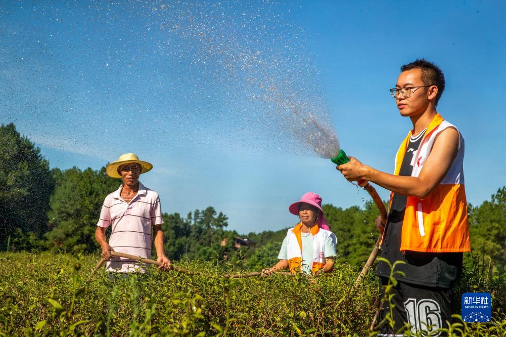 8月19日,重慶市南川區冷水關(guān)鎮機關(guān)干部和茶農一起為茶園澆水抗旱。