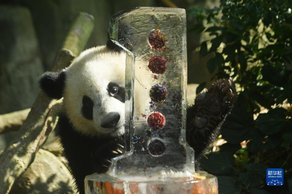8月12日,在新加坡河川生態(tài)園,大熊貓幼崽叻叻在自己的一歲生日慶?;顒?dòng)上品嘗冰塊蛋糕。