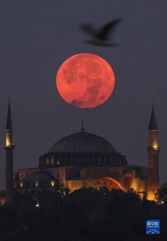 這是8月12日清晨在土耳其伊斯坦布爾拍攝的滿(mǎn)月。