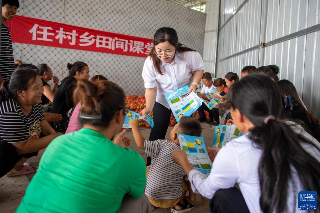 碩士宣講團成員翟亞輝在任村鄉東賈村為村民發(fā)放病蟲(chóng)害防治宣傳單(8月19日攝)。