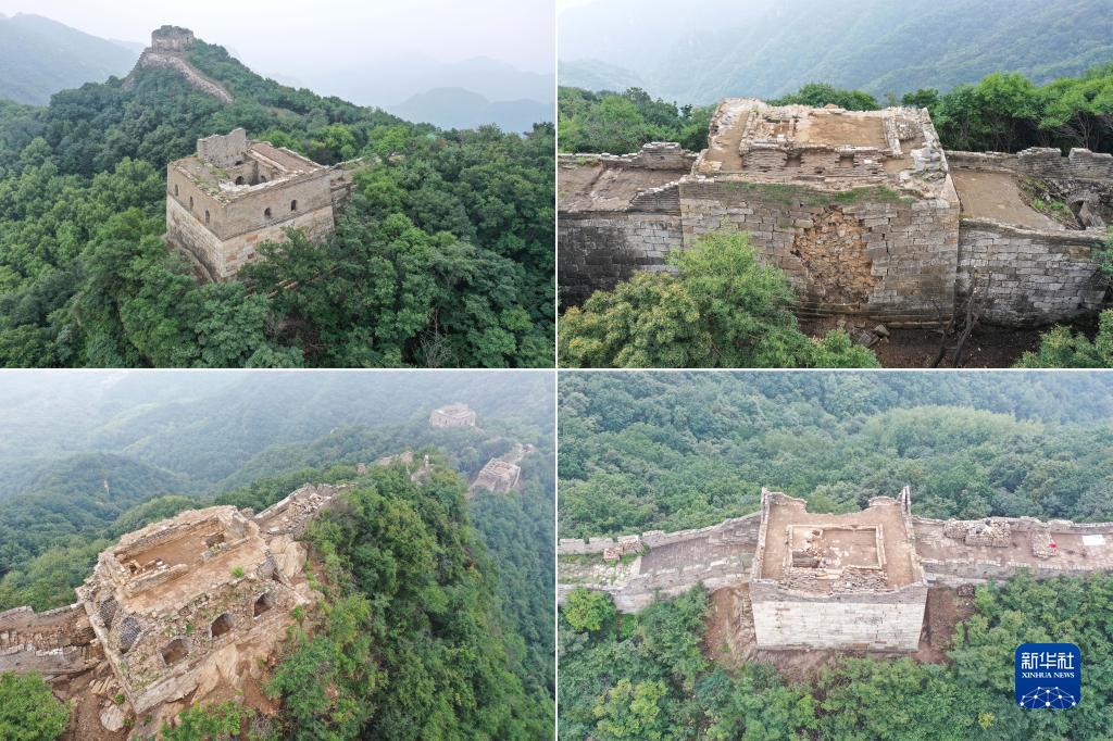 這是研究性修繕段的幾個(gè)敵臺的拼版照片:左上為正在進(jìn)行考古發(fā)掘的142號敵臺;右上為已完成考古發(fā)掘的143號敵臺;左下為已完成考古發(fā)掘的144號敵臺;右下為已完成考古發(fā)掘的145號敵臺(8月17日攝,無(wú)人機照片)。