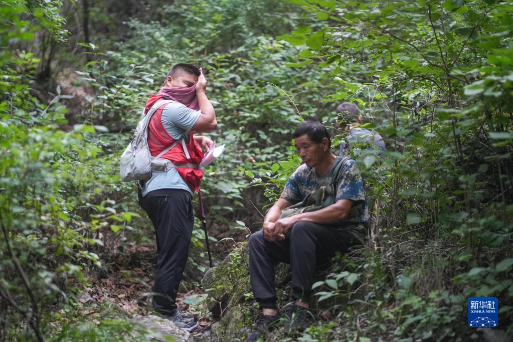 8月17日清晨,從事研究性修繕的技工楊戰杰(左)和工友在登長(cháng)城的山路上休息。