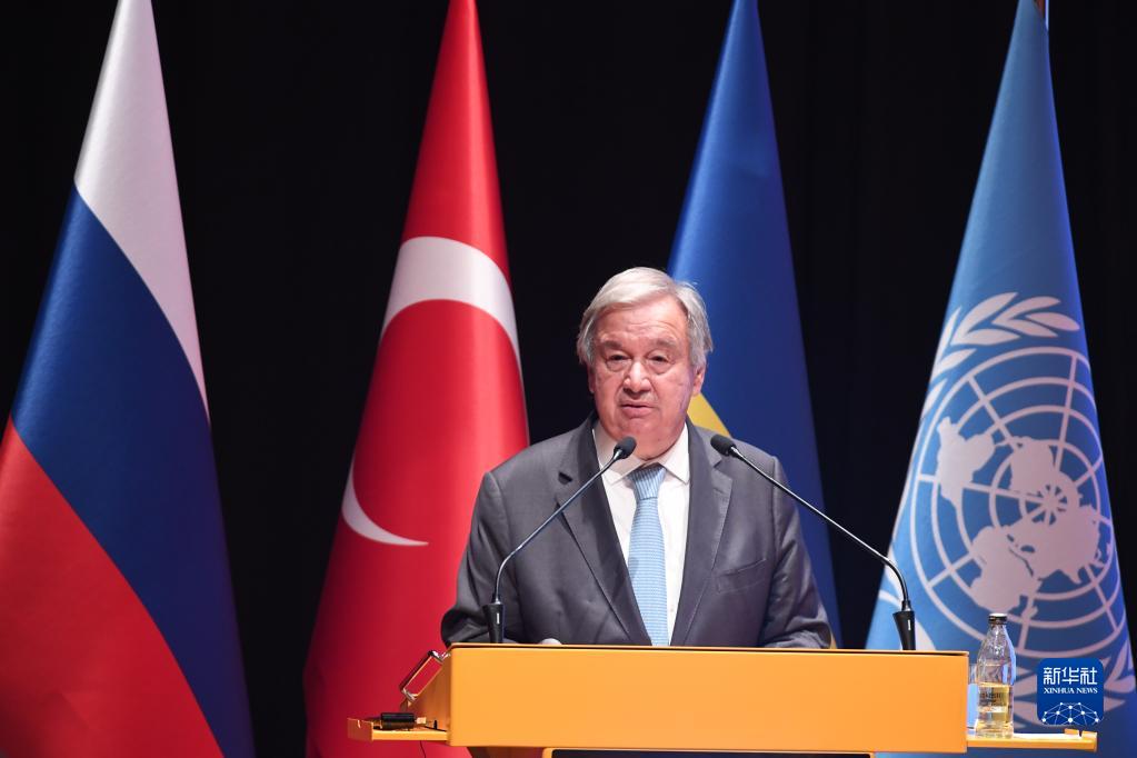 8月20日,在位于土耳其伊斯坦布爾的土耳其國防大學(xué)內的黑海糧食外運聯(lián)合協(xié)調中心,聯(lián)合國秘書(shū)長(cháng)古特雷斯出席新聞發(fā)布會(huì )。
