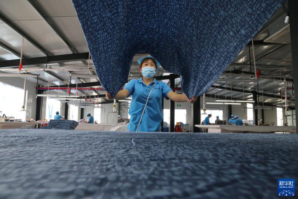 8月21日,濱州市惠民縣一家紡公司工人在整理出廠(chǎng)的床上用品。