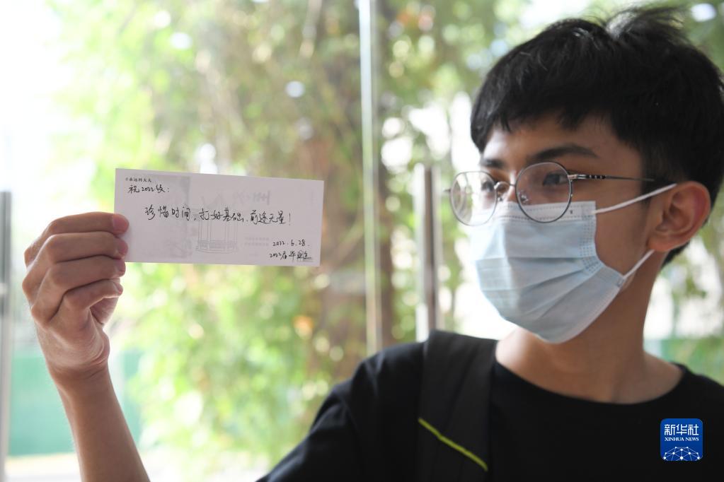 8月21日,中國科學(xué)技術(shù)大學(xué)2022級本科新生陳君旭展示寫(xiě)有學(xué)長(cháng)學(xué)姐祝福的明信片。