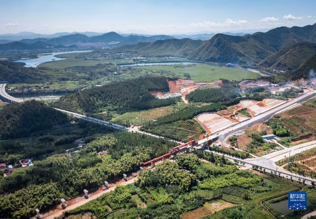 這是宣績(jì)鐵路站前二標首孔箱梁架設現場(chǎng)(8月21日攝,無(wú)人機照片)。