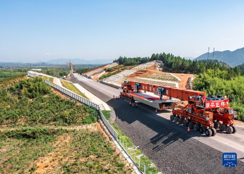 工程設備在宣績(jì)鐵路站前二標首孔箱梁架設現場(chǎng)搬運箱梁(8月21日攝,無(wú)人機照片)。