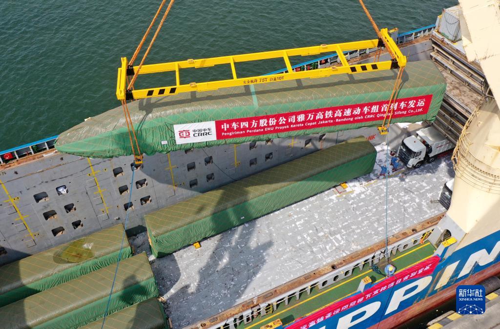 8月21日,我國出口印尼用于雅萬(wàn)高鐵的1組高速動(dòng)車(chē)組和1組綜合檢測列車(chē)在山東港口青島港完成裝船,通過(guò)海運發(fā)往印尼。