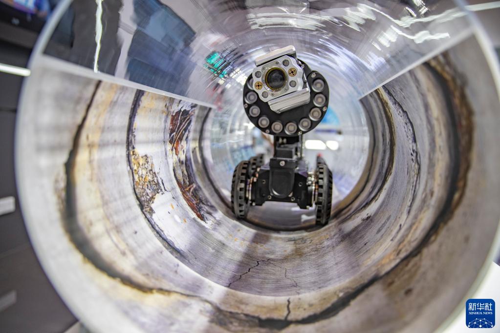 這是8月21日在2022智博會(huì )中央大廳重慶展館內拍攝的非開(kāi)挖管道檢測機器人。