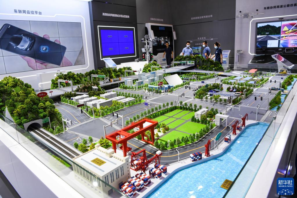 8月21日,嘉賓在2022中國國際智能產(chǎn)業(yè)博覽會(huì )會(huì )場(chǎng)上參觀(guān)車(chē)路協(xié)同沙盤(pán)。