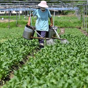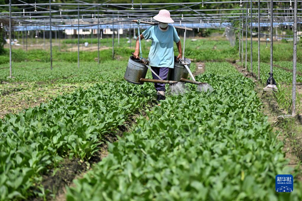 8月22日,三亞市三川葉菜產(chǎn)銷(xiāo)農民專(zhuān)業(yè)合作社的農民在田間澆水。
