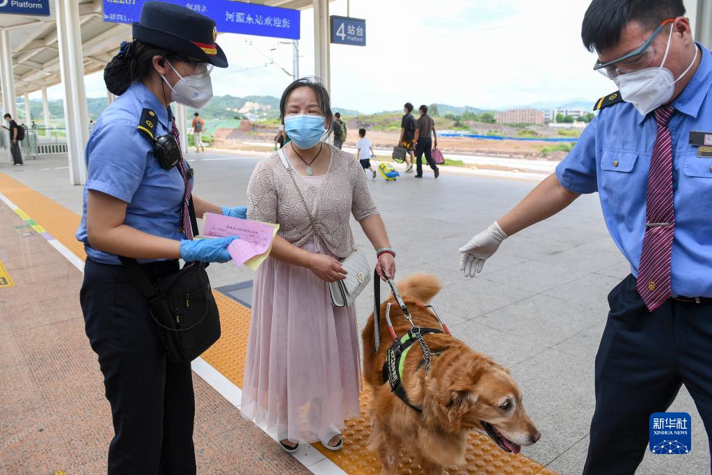 8月19日,在河源東站站臺,客運員張金宇(右)與河源東到深圳北的G2267次車(chē)列車(chē)長(cháng)李雙(左)交接。
