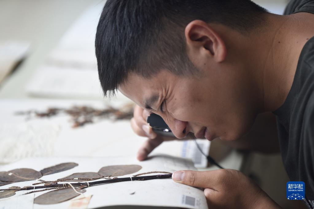 胡君用放大鏡觀(guān)察標本(8月17日攝)。新華社記者 劉坤 攝