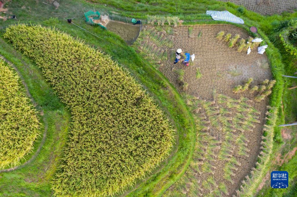 8月22日,貴州省黔東南苗族侗族自治州從江縣丙妹鎮岜沙村村民在收割稻谷(無(wú)人機照片)。
