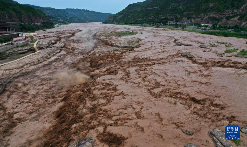 8月22日在山西吉縣拍攝的洪峰過(guò)境的黃河壺口瀑布(無(wú)人機照片)。