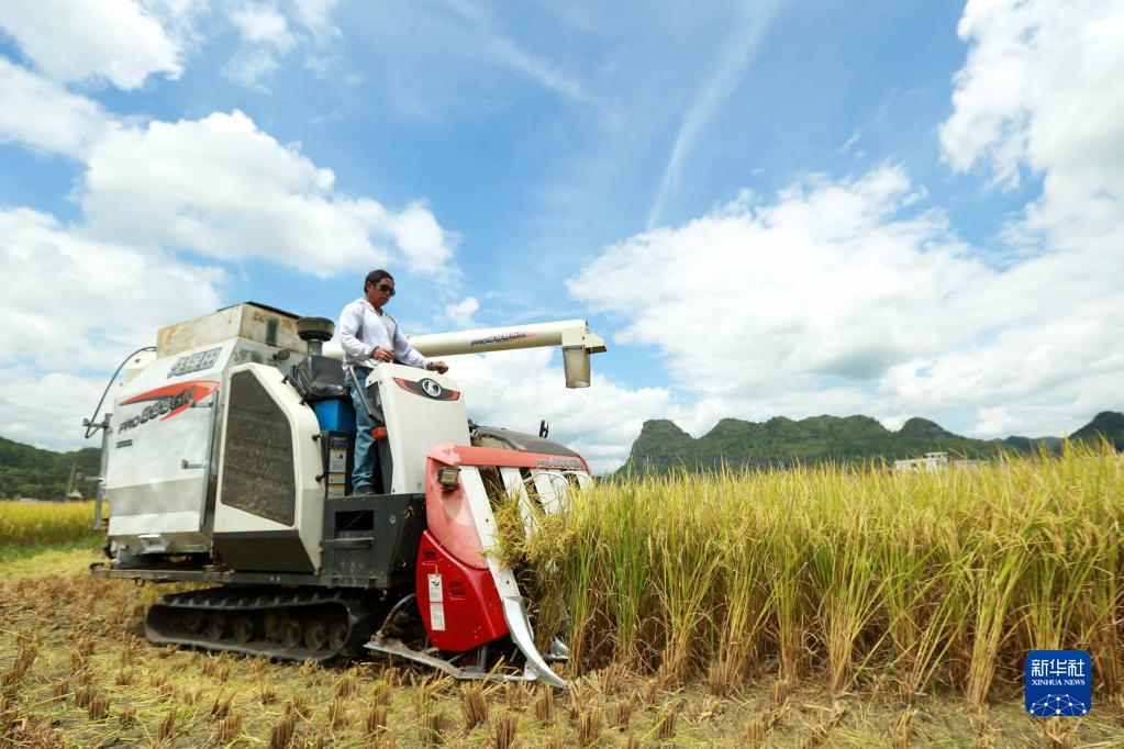 8月23日,農民在貴州省都勻市平浪鎮凱口村收割水稻。