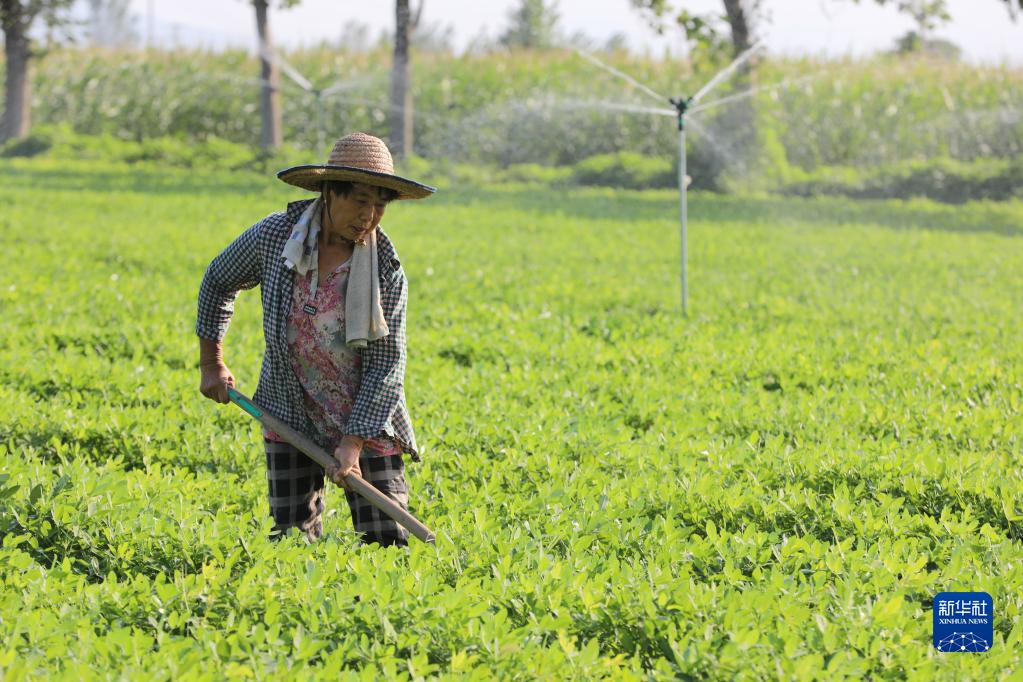 8月23日,河南省焦作市溫縣黃河街道朱家莊村農民在花生田間噴灌、除草。