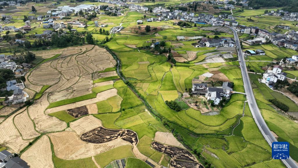 8月23日拍攝的貴州省綏陽(yáng)縣旺草鎮萬(wàn)畝大壩水稻收割現場(chǎng)(無(wú)人機照片)。
