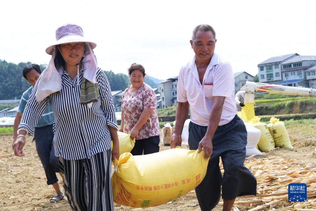 8月23日,村民在貴州省綏陽(yáng)縣旺草鎮萬(wàn)畝大壩搬運剛搶收的稻谷。