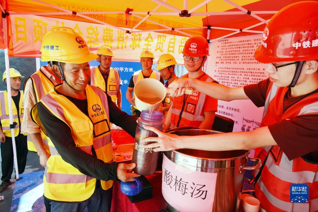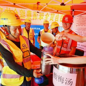 8月23日,青島自貿全球消費綜合體項目部“清涼驛站”的工作人員為建設者分發(fā)酸梅湯。