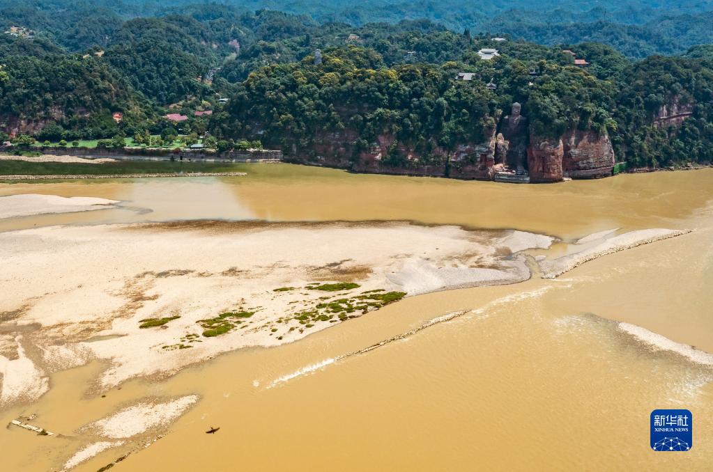 樂(lè )山大佛前方的三江匯流處水位持續降低,部分河床與江灘裸露,樂(lè )山大佛露出底座(8月23日攝,無(wú)人機照片)。