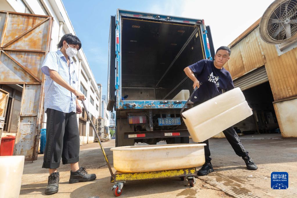 8月23日,上海玉湖制冰有限公司制冰師鄭永慶(右)將冰塊送至一家公司,冰塊將被用于降低工作環(huán)境溫度。新華社記者 王翔 攝