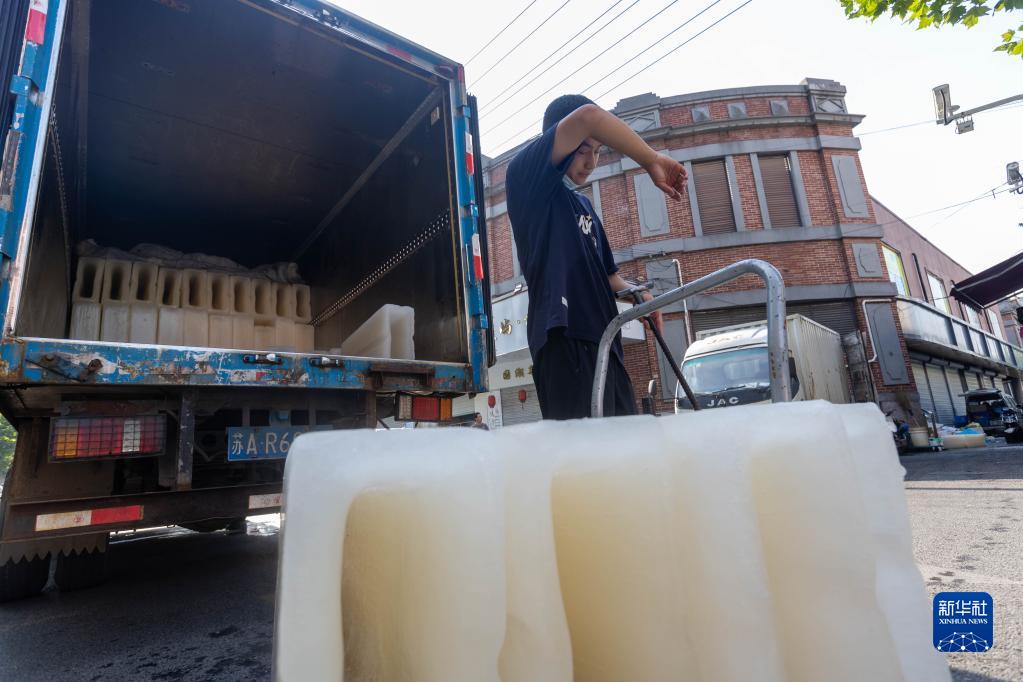 8月23日,上海玉湖制冰有限公司制冰師鄭永慶工作間隙擦拭汗水。新華社記者 王翔 攝