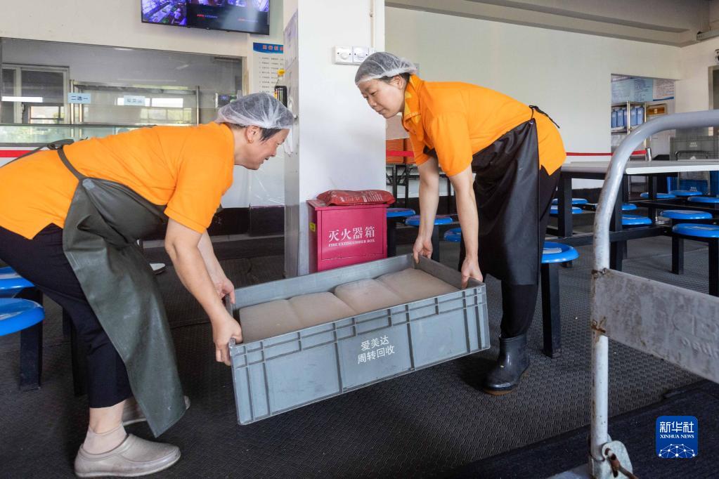 8月23日,上海玉湖制冰有限公司制好的冰塊被送到一家公司食堂用于降溫。新華社記者 王翔 攝