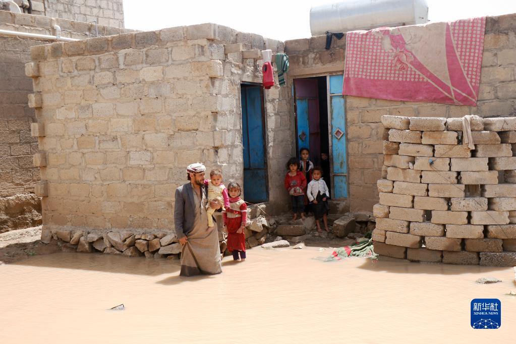 8月23日,在也門(mén)扎馬爾省馬巴爾地區,一名男子與孩子站在被洪水侵襲的房屋前。